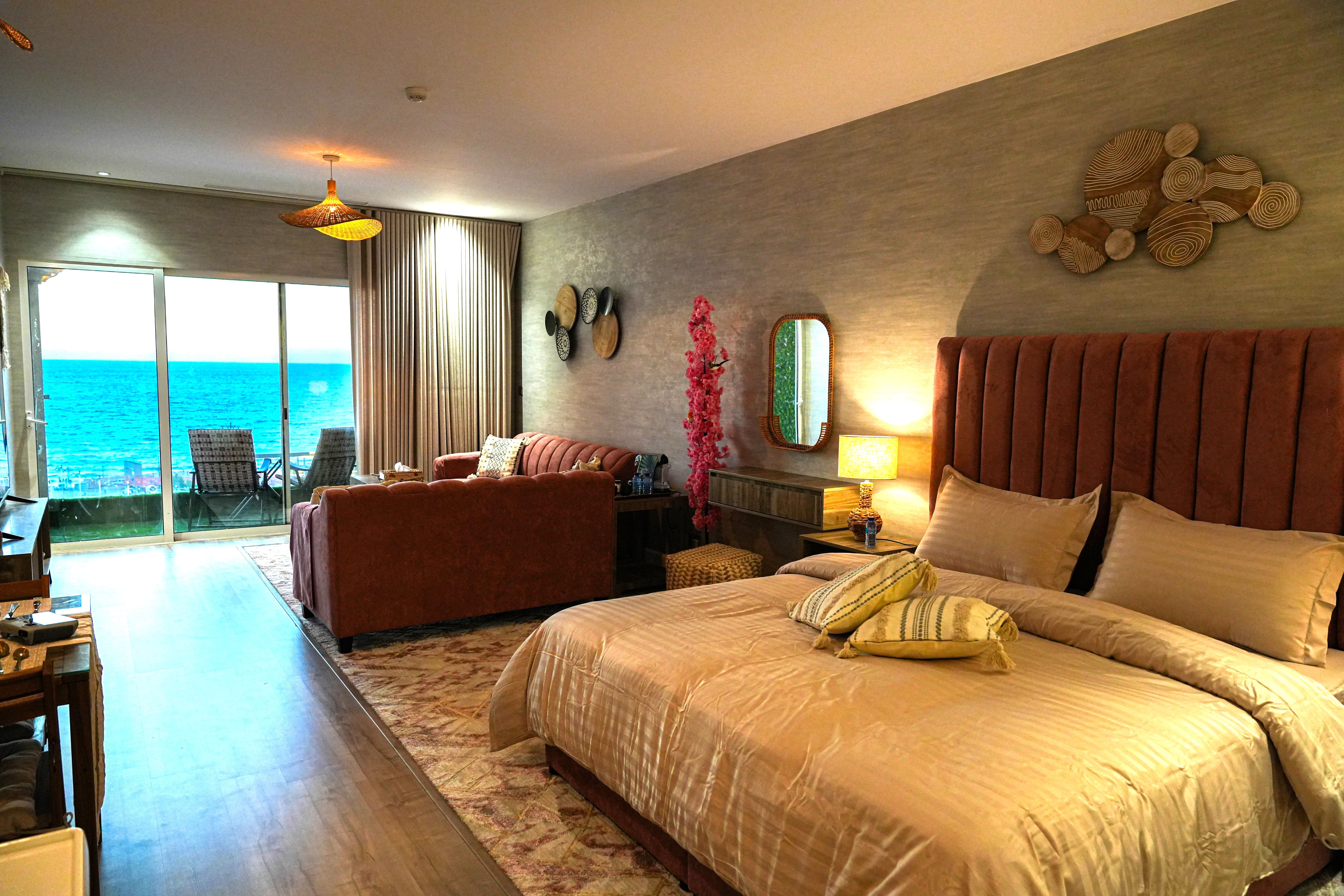 - غرفة مطلة على البحر وحلبة الفورميلا بسرير مزدوج وكنبتين مع طاولات تقديم.