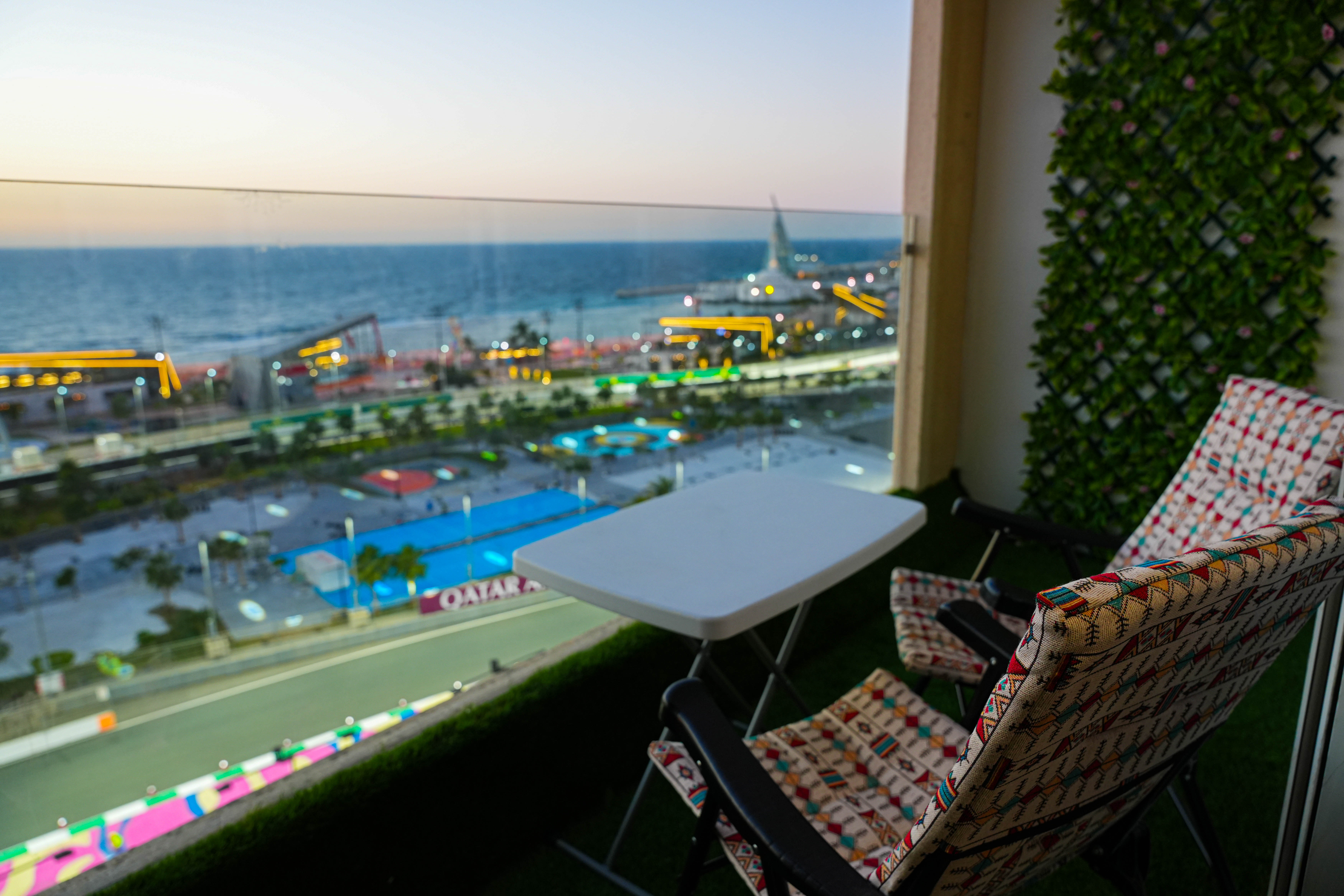 - شرفة خاصة على البحر وحلبة الفورمولا مجهزة بطاولة ومقعدين للاسترخاء والاستمتاع بالإطلالة.